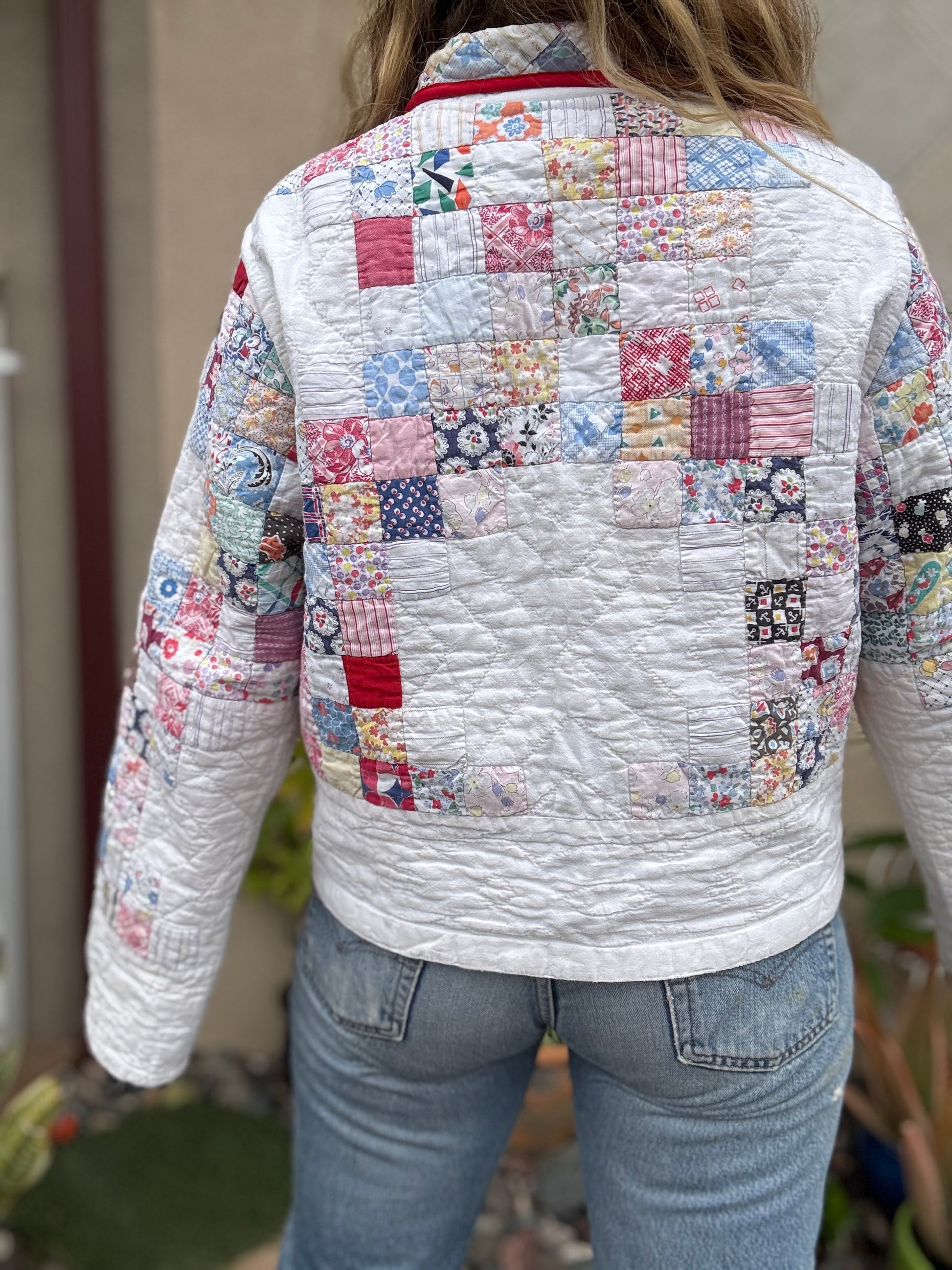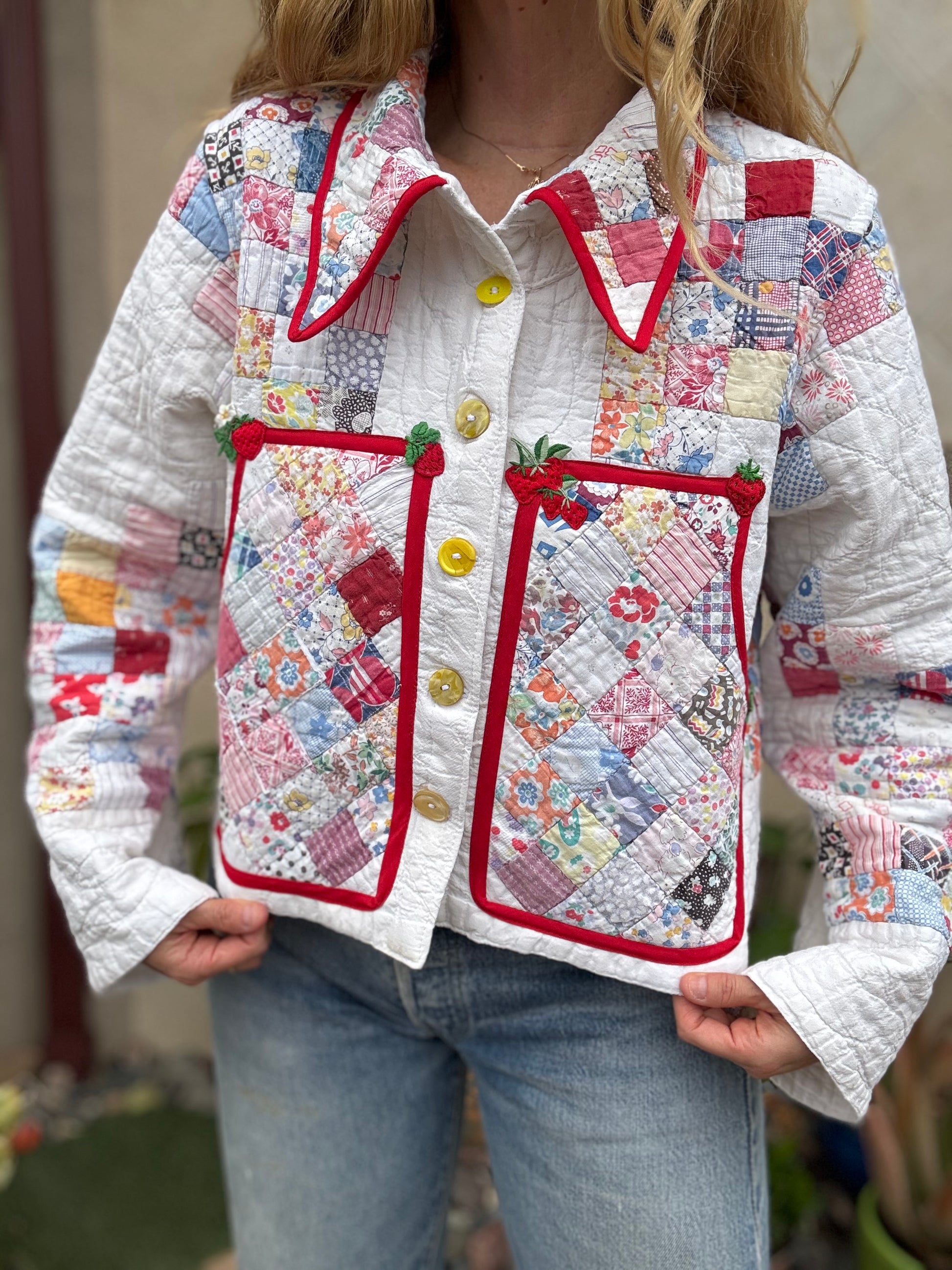 My friend Brian sourced two of these tiny postage stamp quilts and between the two I picked the best parts that were not damaged to make this adorable cropped coat. The Coat features vintage strawberry patches and red trim. I also added extra large front patch pockets and a cute little dagger collar. The buttons are pale yellow and each one is different. This is a Summer-weight light quilt